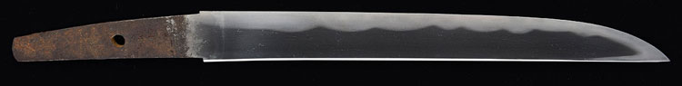 平造り庵棟 うぶ茎 板目肌、柾交じり、やや肌立ちよく詰む。地沸微塵に厚くつき、細かな地景顕われ淡く白気映り立つ。刃紋は湾れに互の目、丁字、尖り心の刃交じる。匂い口フックラと小沸よくつく。飛び焼きかかり匂い足、葉働く。金筋、砂流しかかり、匂い口明るく冴える。末関。出鮫黒呂塗鞘合口拵付き。(特別保存刀剣)
