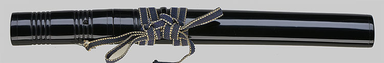 平造り庵棟 うぶ茎 小板目肌、柾交じりよく詰む。地沸微塵につき、細かな地景顕われ、淡く白気映り立つ。刃紋は湾れに互の目交じる。匂い深めに沸、小沸よくつく。湯走り、喰い違い刃かかり、葉働く。金筋、砂流しよくかかり、明るく冴える。関の北郊、上有知に住す美濃鍛冶。業物。黒笛巻鞘小刀拵付き。(保存刀剣)