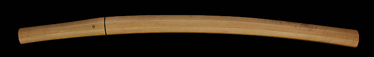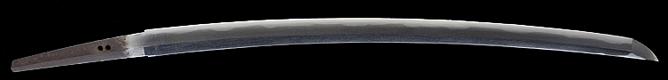平造り庵棟 うぶ茎 板目肌、杢交じりよく練れ詰む。地沸つき、細かな地景顕われ白気映り立つ。刃紋は細直刃、浅く湾れて小乱れ交じる。匂い口締まり心に小沸よくつく。刃縁ほつれ僅かに小足、葉働く。僅かに金筋、砂流しかかり明るく冴える。末関、室町末期。(保存刀剣)