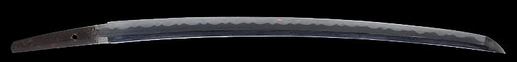 本造り庵棟 うぶ茎 小板目、柾交じりよく詰む。地沸微塵につき、細かな地景顕われ、淡く白気映り立つ。刃紋は広直刃、浅く湾れて互の目交じる。