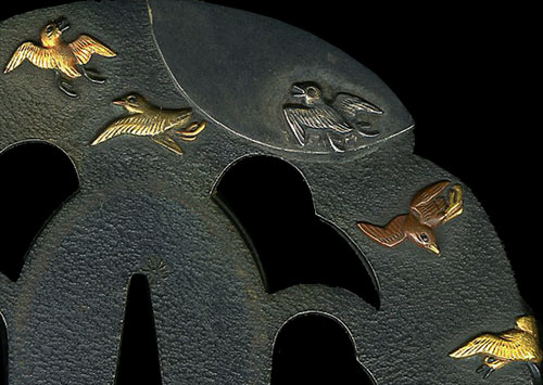 鐔 木爪形 赤銅石目地 鋤下毛彫 地透 象嵌色絵 角耳小肉