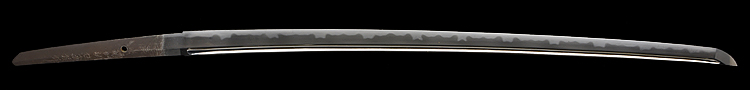 本造り庵棟 うぶ茎 小板目肌、柾交じりよく詰む。地沸厚くつき、細かな地景顕れ、淡く白気風の映り立つ。刃紋は湾れに互の目、丁字、尖り心の刃交じる。匂い口ややフックラと小沸よくつく。僅かに足、葉働き、金筋、砂流しかかり明るく冴える。M入り。村山喜之一。国工院会員名誉宗匠。陸軍受命刀匠。黒呂塗鞘打刀拵入り。(960g)