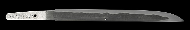 本造り庵棟 うぶ茎 小板目肌、柾交じりよく詰む。地沸微塵につき、細かな地景顕われ淡く映り立つ。刃紋は広直調子、浅く湾れて互の目交じる。匂い口やや深めに小沸つく。匂い足、葉よく働く。金筋、砂流しよくかかり明るく冴える。表裏に棒樋の彫刻。本名、山越健一。宮入清宗の門。
