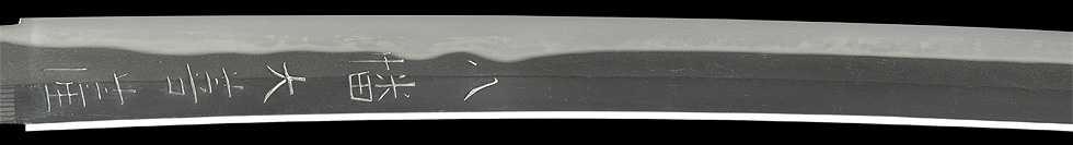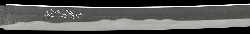 本造り庵棟 うぶ茎 板目肌、杢交じり、よく練れよく詰む。地沸微塵に厚くつき、地景よく入り乱れ映り立つ。刃紋は太直調子、浅く湾れて、互の目、小互の目交じる。匂い口、フックラと小沸よくつき、小足、葉、盛んに働く。金筋、砂流し頻りにかかり、匂い口明るく見事に冴える。表に八幡大菩薩の文字、裏に梵字の彫刻。☆☆第24回重要刀剣☆☆