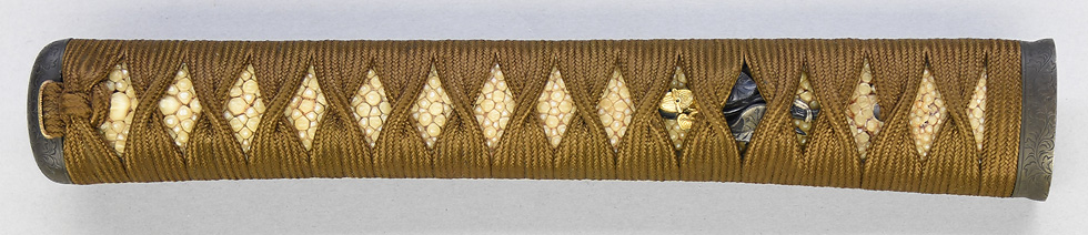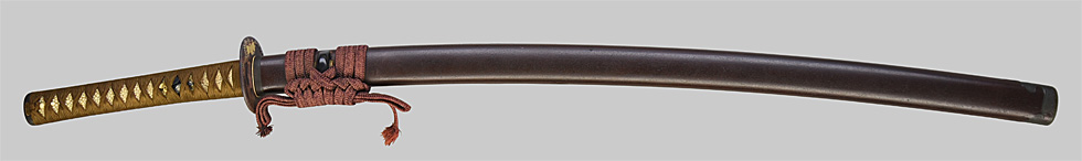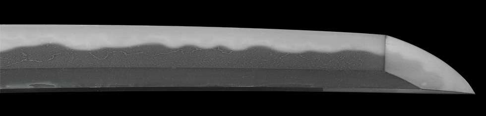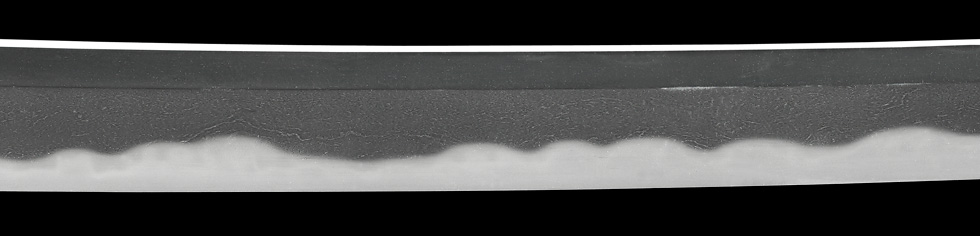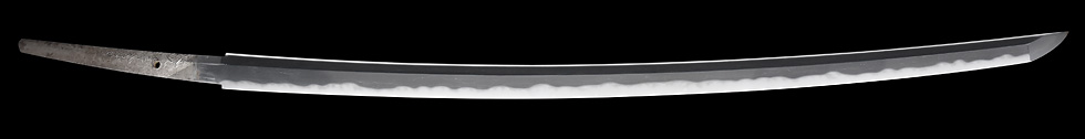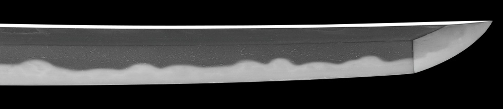 本造り庵棟 うぶ茎 板目肌、杢交じりややザングリと肌立ちよく詰む。地沸微塵に厚くつき、細かな地景よく入り、淡く沸映り立つ。刃紋は湾れに互の目、丁字、尖り刃交じる。匂い深く、沸、小沸よくつく。石堂運寿是一精鍛作足、葉盛んに働き、金筋、砂流し頻りにかかる。匂い口明るく見事に冴える。本名は政太郎。七代目石堂是一。運寿斎のちに龍泉斎と号す。長運斎綱俊の子。石堂家忠興の名手。焦茶石目塗鞘打刀拵付き。☆☆第17回重要刀剣☆☆