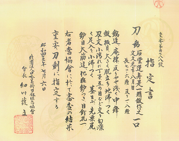 石堂運寿是一精鍛作之 文久元年八月日 (第17回重要刀剣)