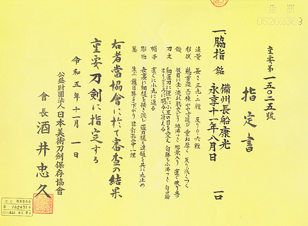 <新入荷>備州長船康光 永享十一年八月日 (第69回重要刀剣)