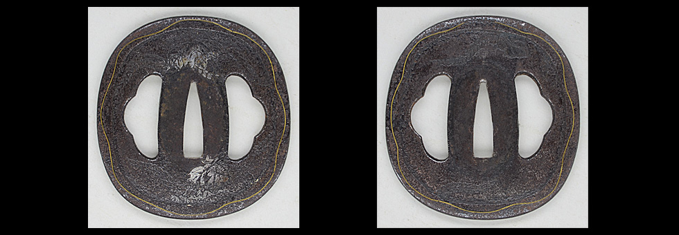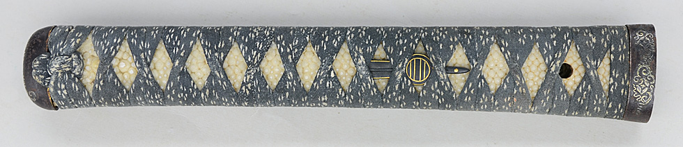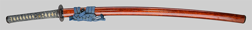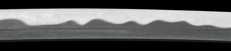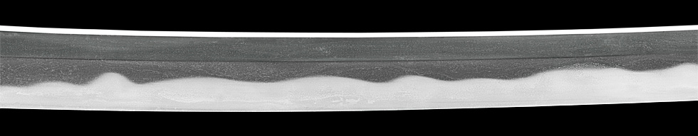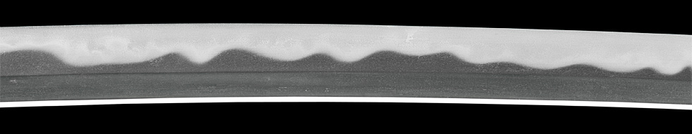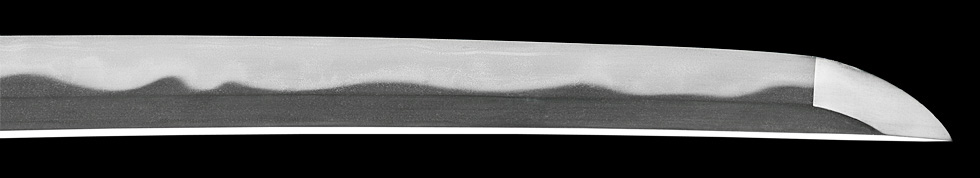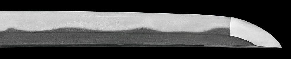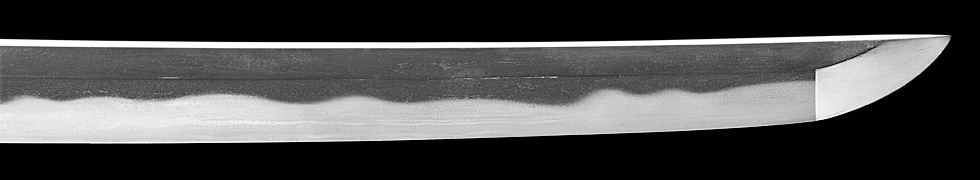 本造り庵棟 うぶ茎 板目肌、杢交じりややザングリと肌立ちよく詰む。地沸微塵に厚くつき、地景よく入り淡く沸映り立つ。刃紋は湾れに互の目、丁字、尖り心の刃交じり、盛んに乱れる。匂い深めによく沸づく。湯走り飛び焼かかり、金筋、砂流し頻りにかかる。匂い口明るく見事に冴える。國広門下の代表工。茶漆金散塗鞘打刀拵付き。☆☆第25回重要刀剣☆☆