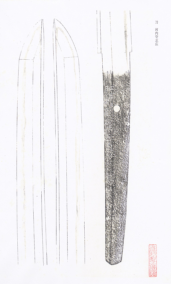 本造り庵棟 うぶ茎 小杢目肌見事に詰み、梨地肌となる。地沸微塵に厚くつき、細かな地景よく入り淡く映り立つ。地鉄精美。刃紋は広直刃、浅く湾れて小乱れ交じる。匂い深くよく沸づく。小足、葉見事に働き、細かな金筋、砂流し頻りにかかる。匂い口、明るく見事に冴える。河内大掾正広の子、初銘正永。☆☆第18回重要刀剣☆☆