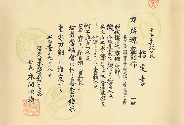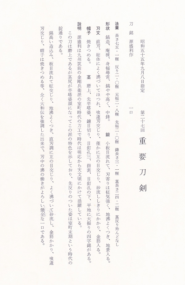 | 刀 | 源盛利作 (西海道) (第27回重要刀剣) | 室町後期 | 重要刀剣 | 特優品 | ¥5,500,000 |