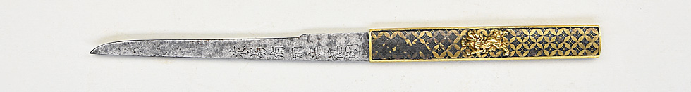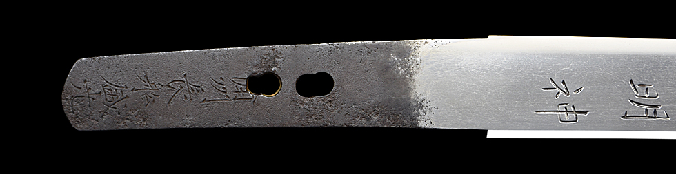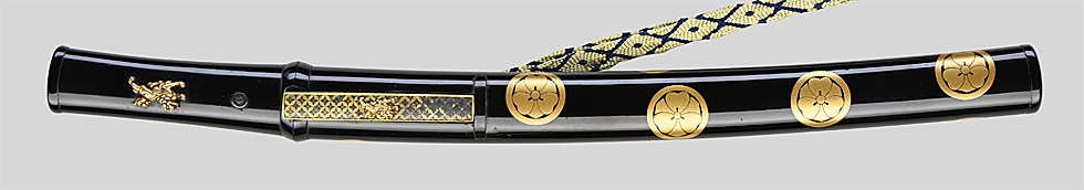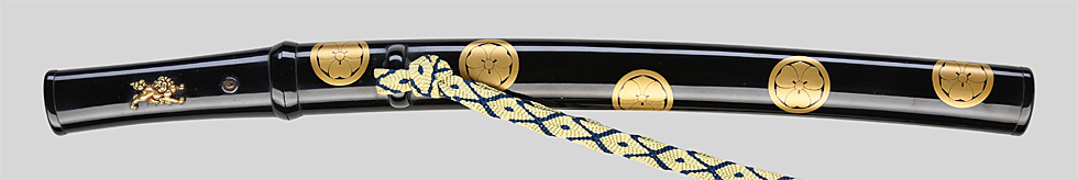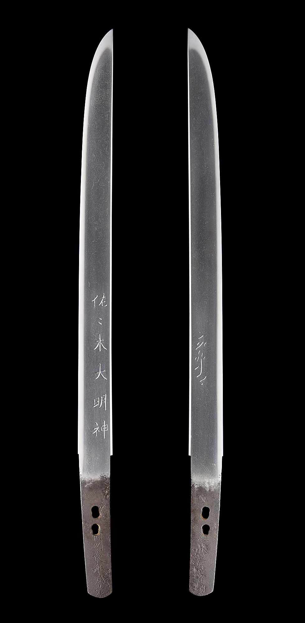 平造り三ツ棟 うぶ茎 板目肌、杢交じりよく練れよく詰む。地沸微塵に厚くつき、細かな地景よく入り刃縁に沿って棒映り鮮明に立つ。刃紋は中直刃浅く湾れる。匂い口フックラと小沸よくつく。刃縁に細かな金筋よく絡み、砂流しかかり、匂い口明るく見事に冴える。表に佐々木大明神。裏に梵字の彫刻。修理亮。初代盛光の子。応永備前の明工。大業物。黒呂塗家紋蒔絵鞘合口拵付き。☆☆第38回重要刀剣☆☆