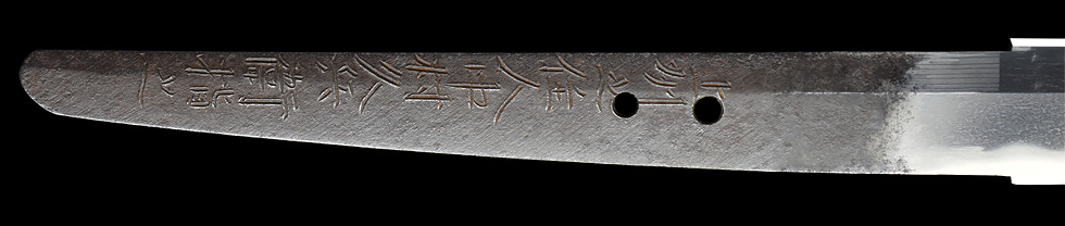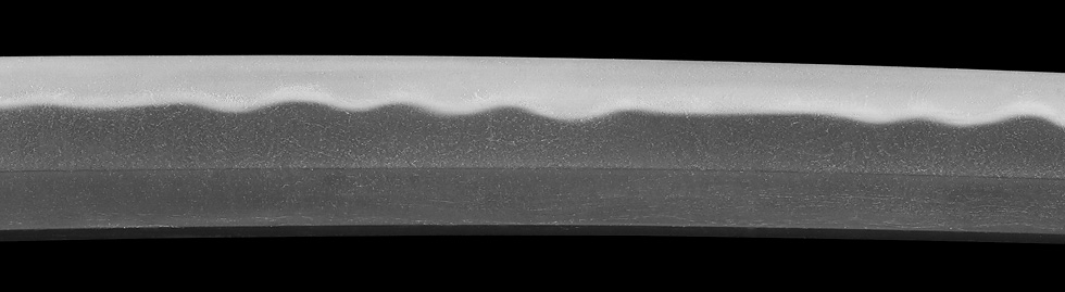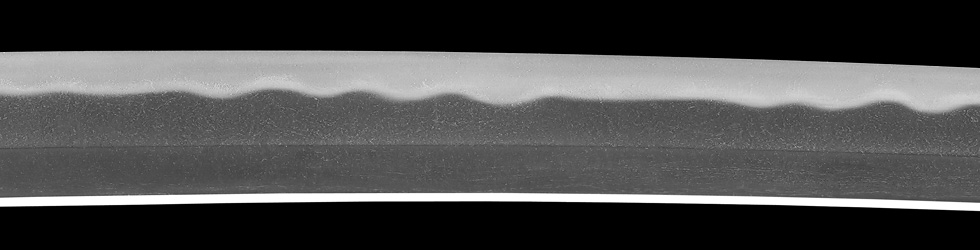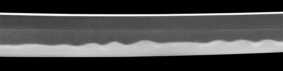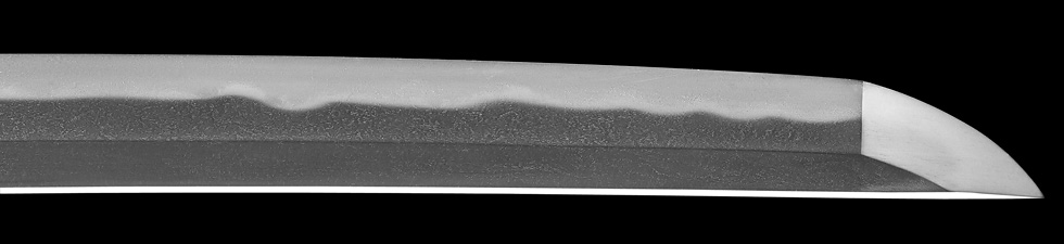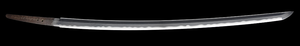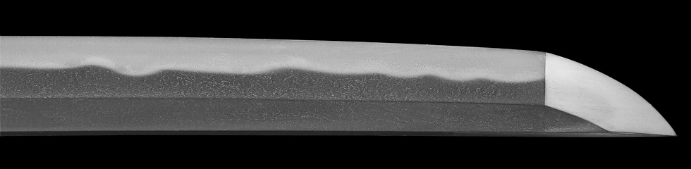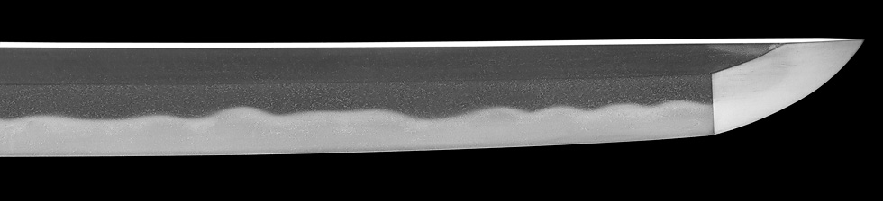 本造り庵棟 うぶ茎(僅か区送り) 板目肌、杢交じりザングリと肌立ちよく練れ詰む。地沸微塵に厚くつき、細かな地景よく入り、淡く沸映り立つ。刃紋は湾れに互の目乱れ、尖り心の刃交じる。匂いやや深めに沸、小沸よくつく。沸足、葉盛んに働き、金筋、砂流しかかる。匂い口明るく見事に冴える。堀川國廣門人。國廣没後摂州尼崎へ移住。國廣の代作者のせいか、本人の作品少ない。業物。☆☆第22回重要刀剣☆☆