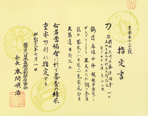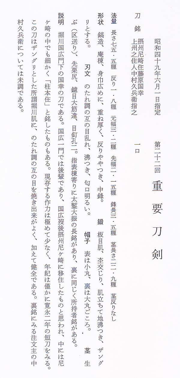 摂州尼崎住藤原国幸 上州之住人中村久兵衛指之 (第22回重要刀剣)
