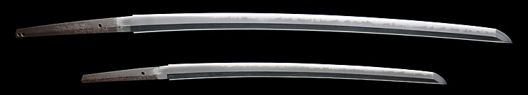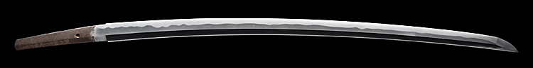 本造り庵棟 うぶ茎 板目肌、杢交じりよく詰む。地沸微塵に厚くつき、細かな地景よく入り、淡く乱れ映り立つ。刃紋は互の目乱れ、丁字、尖り心の刃交じる。匂い口フックラと小沸よくつく。匂い足盛んに入り、葉働く。金筋、砂流しよくかかり、匂い口明るく見事に冴える。庄司蓑兵衛。水心子正秀門人。秋元家抱工。 素銅金具黒笛巻鞘略太刀拵付き。最上作(特別保存刀剣)