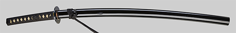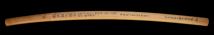 本造り庵棟 うぶ茎 小板目肌、杢交じり地鉄精良によく詰む。地沸微塵に厚くつき、細かな地景よく入り、淡く沸映り立つ。刃紋は湾れに大互の目、丁字交じり涛乱風に乱れる。匂い深く沸、小沸よくつく。沸足、葉働き、頻りに金筋、砂流しかかる。匂い口明るく見事に冴える。本名は坂倉言之進。美濃國照門の門。のち初代越後守包貞の門人となり初銘を輝包と切る。二代目越後守包貞を継ぐ。のちに初代包貞の実子に家督を譲り、自らは坂倉言之進照包に改銘す。大業物。 黒呂塗鞘打刀拵付き。(特別保存刀剣)