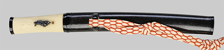 平造り庵棟 うぶ茎 小板目肌、柾交じりよく詰む。地沸微塵につき、細かな地景顕われ、淡く白気映り立つ。刃紋は湾れに互の目交じる。匂い深めに沸、小沸よくつく。湯走り、喰い違い刃かかり、葉働く。金筋、砂流しよくかかり、明るく冴える。関の北郊、上有知に住す美濃鍛冶。業物。黒笛巻鞘小刀拵付き。(保存刀剣)
