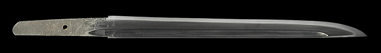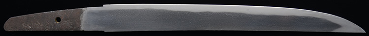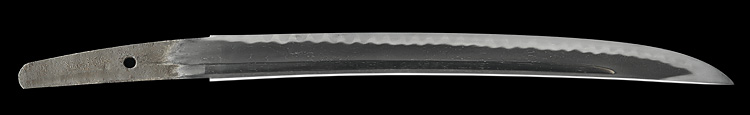 平造り庵棟 うぶ茎 板目肌、柾交じり、やや肌立ちよく詰む。地沸微塵に厚くつき、細かな地景顕われ淡く白気映り立つ。刃紋は湾れに互の目、丁字、尖り心の刃交じる。匂い口フックラと小沸よくつく。飛び焼きかかり匂い足、葉働く。金筋、砂流しかかり、匂い口明るく冴える。末関。出鮫黒呂塗鞘合口拵付き。(特別保存刀剣)