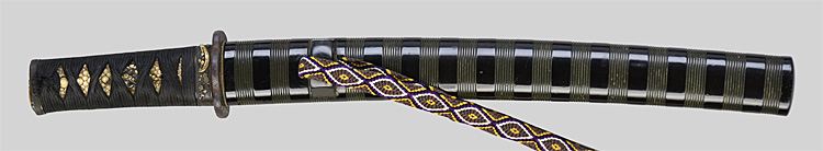 冠落し造り庵棟 うぶ茎 小板目肌、杢交じりよく練れ詰む。地沸微塵に厚くつき、細かな地景よく入り、淡く沸映り立つ。刃紋は広直刃、浅く湾れて小乱れ交じる。匂い口フックラと沸、小沸よくつく。刃縁ほつれ、僅かに小足、葉働く。金筋、砂流しかかり匂い口明るく冴える。黒石目模様塗鞘小方拵付き。(特別保存刀剣)
