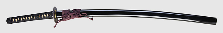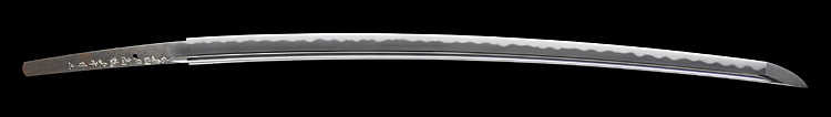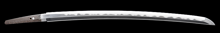 平造り庵棟 うぶ茎 板目肌、杢交じりやや肌立ち心によく練れ詰む。地沸微塵に厚くつき、細かな地景顕われ、棒映り鮮明に立つ。刃紋は細直刃浅く湾れて小乱れ交じる。匂い口フックラと小沸よくつく。刃縁ほつれ、僅かに小足働く。刃縁に金筋、砂流しかかり、匂い口明るく冴える。末備前の長船清光一門の代表工の一人。朱塗鞘合口拵付き。(特別保存刀剣)