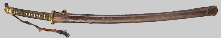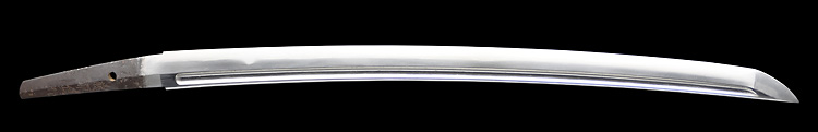 本造り庵棟 うぶ茎 柾目肌、小板目交じりよく詰む。地沸つき、細かな地景顕われ、淡く白気映り立つ。刃紋は中直刃浅く湾れて小乱れ交じる。匂い口締まり心に小沸よくつく。刃縁ほつれ、僅かに小足、葉働く。僅かに金筋、砂流しかかり、明るく冴える。皮包陸軍軍刀拵入り。