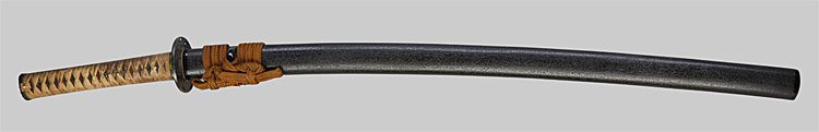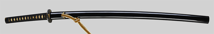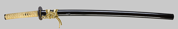 本造り庵棟 うぶ茎 小板目肌、柾交じり見事に詰む。地沸微塵に厚くつき、細かな地景顕われ、淡く沸映り立つ。地鉄精美。刃紋は互の目乱れ、丁字、尖り心の刃交じる。匂い口フックラと小沸よくつく。匂い足、葉盛んに働く。金筋、砂流しよくかかり匂い口明るく見事に冴える。表裏に棒樋の彫刻。隅谷與一郎。桜井正幸の門。立命館大学卒。人間国宝。金梨地塗鞘打刀拵付き。(保存刀剣)
