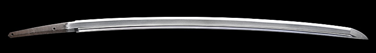 薙刀造り三ツ棟 磨上茎 小板目肌、杢交じりよく練れよく詰む。地沸微塵に厚くつき、細かな地景よく入り、乱れ映り鮮明に立つ。刃紋は直調子、浅い湾れに小互の目交じる。匂い深めに小沸よくつく。金筋、砂流しかかる。匂い口締まり、明るく見事に冴える。表裏に薙刀樋の彫刻。備前國宇甘住。雲生の子。(第31回重要刀剣)