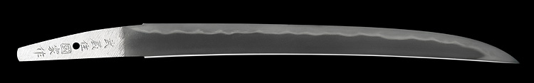 平造り庵棟 うぶ茎 板目肌、柾交じりよく詰む。地沸微塵に厚くつき、細かな地景顕われ、淡く沸映り立つ。刃紋は互の目乱れ、匂い口フックラと小沸よくつく。匂い足、葉働き、金筋、砂流しかかる。匂い口明るく冴える。本名は長尾栄吉。大慶直胤門人。心慶と号す。長尾包定家を再興し名跡をつぐ。土浦藩工。青貝微塵塗鞘短刀拵付き。(特別保存刀剣)