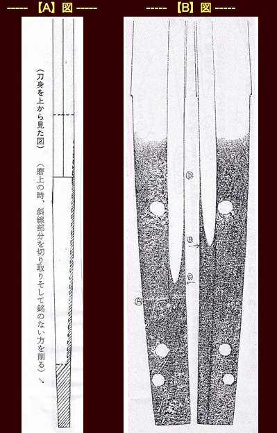 さて、長い寸法を磨上にすればする程、新規の中心は元来の刀身の部位になってくる。これは何を意味するかといえば刀身は上(切先に向かって)に行くほどに重は 薄 〔 うす 〕 くなるから、新規の中心を 形作る 〔 かたちづくる 〕 時には、この重の逆転現象を工作しなければ中心として 拵 〔 こしらえ 〕 の 柄 〔 つか 〕 に収まらない。何故なら、中心は 研溜 〔 とぎだまり 〕 から 中心尻 〔 なかごじり 〕 に向かって重は薄くなるからである。これを簡単に示したのが、【A】図(別図参照)で ある。【A】図をみると刀の両面を削らずに必ず片面、殊に在銘ならば銘のない片面を削って重を調整していく。磨上た中心の重のセンターが削らない方へ僅か に振れるが、これはすぐに戻せるから余り障害とはならない。では、表裏に銘がある場合には難作業になるが結論的には全部の銘を極力残すようなるべく片面、 やむをえなければ両面を少しずつギリギリの所で調整する。従って肉置、鎬筋はかなり変化するし、最悪の時は作者銘以外を犠牲にしなければならない事もあ る。