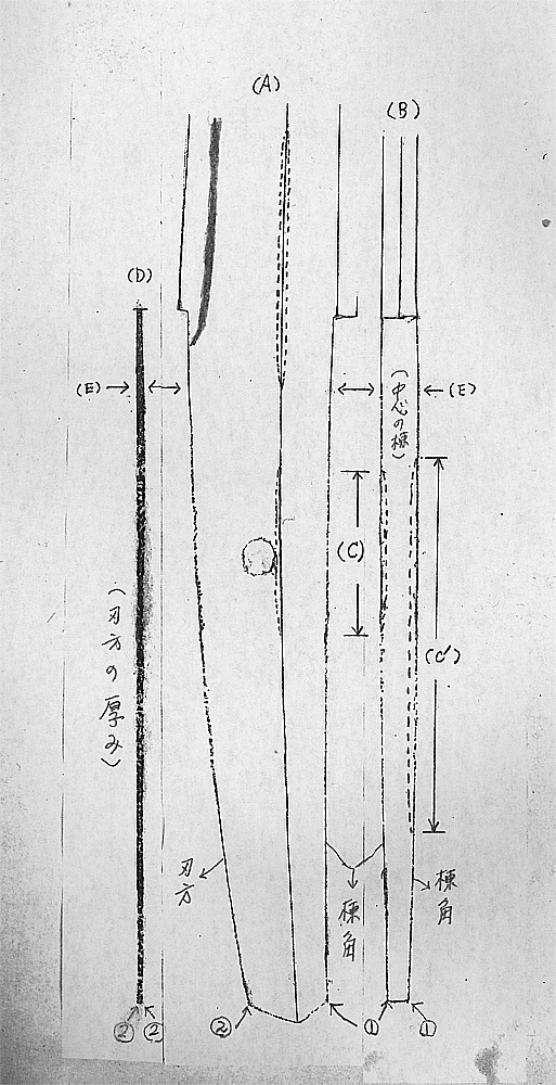 恐れがあります。但し、下手な研ぎで鎬筋を崩している時もありますので御注意下さい。継中心の時は(E)の付近に