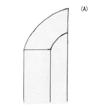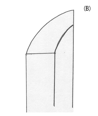 切先で一番嫌われる形がある。それは詰まった切先とされるものである。理想の切先としてはフク ラのカーブ(曲線)と小鎬のカーブは互いに平行した二本の円弧状の形(扇状)になるのが良い。(A)