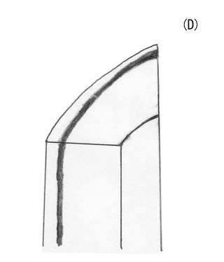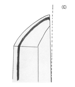 簡単にいうと、これが本当のプロセスであって、最初から(C)のように内側(刃方)へうつむく形 (姿)はないのである。但し、写物は別であって、本歌(本科)の姿がうつむいたのをそのまま写した ものとは区別しなければいけない。
