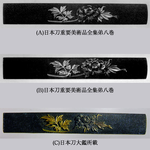 さて(A)と(B)と(C)を見比べて頂きたい。この3点ともに有名な宗珉の所謂、「一輪牡丹の図柄」である。この(A)の解説に「同図は数口現存するが、いずれも花弁の開き方が一様でなく、少しづつ異なっているなど実に写実的に作られている。」とある。宗珉作の重美指定は10点以上があるが、それらの解説を読むと、宗珉の写実の素晴らしさや、彫技の細かさを褒めているようである。