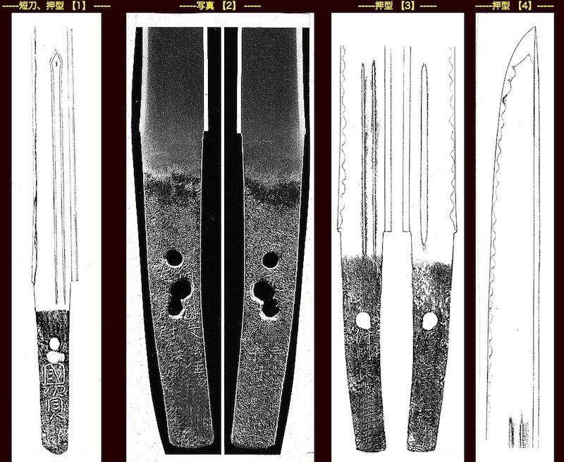 さらに(4)の押型をみて下さい。この短刀の鋩子はかなりかなり深く描かれているのも 不審であります。下部がこれだけ減っている(刃区の上部の刃先が凹んでいる)のに、上 の方がかくも健全でありうるでしょうか。物理的には短刀(刀でも)は切先のあたりが一 番欠損するのですから、一番欠損する部分が健全で、原型を維持しやすい下部がかなり 減るというのは、不合理そのものであります。