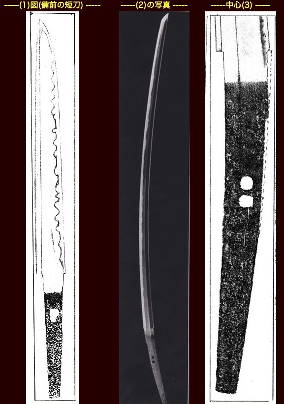さて、(1)図(備前の短刀)をみて頂きたい。まず第一に現在の刃区から刃文が始まっ ている事に注目して頂きたい。そして、刃先の刃区角(はさきのはまちかど)からフクラ あたり迄の刃先の線の凹み具合をみて下さい。それと互の目乱の谷の部分の全体の線を 目線で見比べて頂くと、その二つの線がほぼ平行した状態となっています。これが重要 な見所となってきます(前回の本欄参照)。