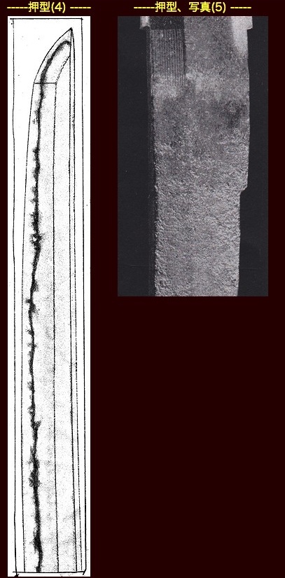 そこに加えて、この中心の錆状態(以前に紹介したのも国行でありましたが)は異常で あります。これは本欄で既述の事ですから今回は触れません。本刀の研溜(とぎだまり) 付近は凹凹ではなく綺麗で平面的でありますが、これは研溜と刀身との段差がかなりひ どくなったので、砥石でとり去って、ハバキも入りやすくガタつかないようにした筈で す。押型、写真(5)をみても鑢目は全く看取出来ず、本来、鑢目があるなら、つまり刀身 が減っていないならここには本来(刀工)の鑢目が必ず残ります。それが残されていない というのは、本刀がかなり減っている(下の方も)という事を如実に示しています。