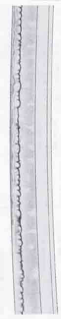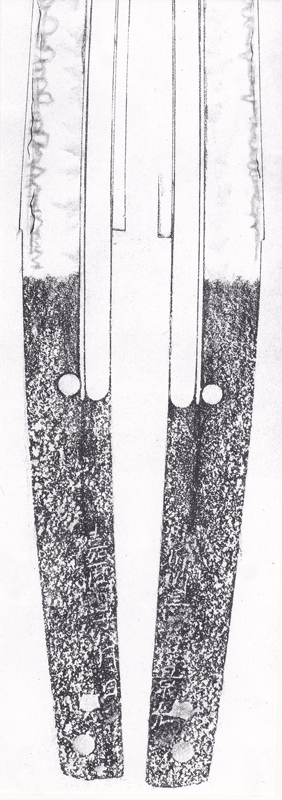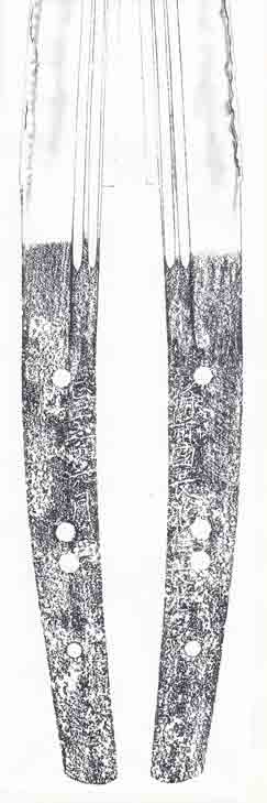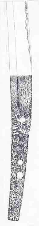 さて、刃文の谷をみて下さい。殊に佩表がよくわかりますが刃先に平行していますね。しかも、例の筋状のものが描かれていることもわかります。本刀は(1)図よりも中心の銘字部分の状態は良く、鑢目も残ってはいます。但し、本刀の指定書の説明には生中心とありますが、生中心ではないと思います。上から二番目の孔が生孔とみる以外にはないようです。