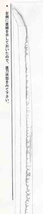 さて、本題に移ることにしたい。前回の(8)図と(1)図の押型に 黒い曲線、直線状に描かれていた刃中の所作であるが、総体的に刃中(刀身全域)に出現するが 、殊にハバキ元には一番出現しやすい所作であり、再刃とみるべき(考えるべき)一つの状況証拠(確証ではない)でもある。それと、地肌にもチリチリと丸 まった様な黒い筋状のもので、異常に黒っぽく光るギラギラした所作が出たのがあるが 、これも前述の刃中の所作と同じで、再刃を疑う(警戒する、考える、推測する)一つの状況証拠であるが、それらのみで速断することは絶対に控えるべきであ る事を強調しておきたい。つまり、これらの状況証拠を積みかさねた上に、不合理なことがどうしても解消されなければ、再刃と断定せざるを得ないのである。