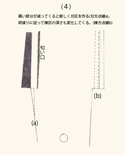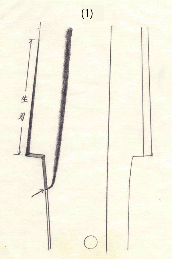 つまり、研磨によって次第に刀の身幅、殊に刃幅が狭くなることは絶対に避けられない日本刀の宿命である。さて、ハバキを作成する時、刃区を欠損させる事例はよく起きるもので、そのような事態になれば新たに刃区を作る以外になく、元来の生刃はなくなる。それは前回<十一回>に図示した(4)図となる。新しい日本刀は殊に地鉄が剛い傾向にあり、又、刃区という部分が中心からせり出した三角形状のものであり、厚さも薄いので力学的にも弱い構造といえよう。従って、刃先を平面にして力学的に強くしたのが生刃ともいえる。