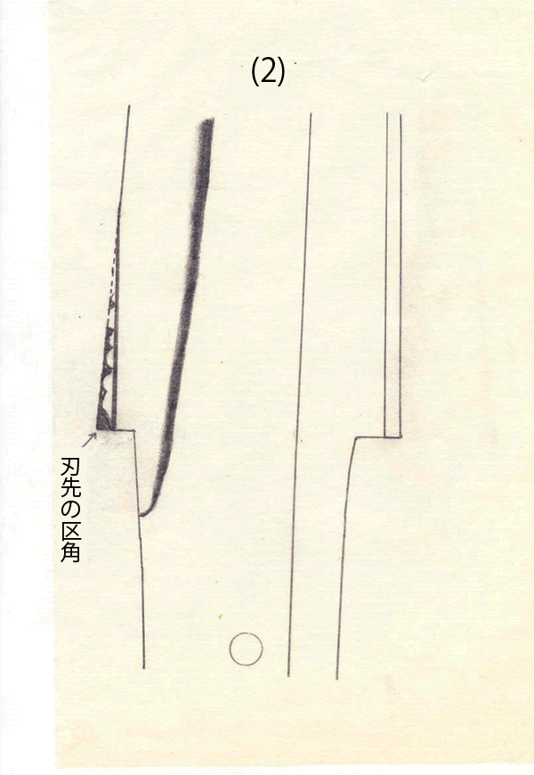 さて、(2)図は(1)図を真正面から見た状態を図示したのであるが、「刃先の区角」が三角形状に欠損し、上部にも刃毀(はこぼれ)が生じた場合、刃先を引いて整形すれば(2)図中の太い直線状に示したようになるが、その太い直線の部分は刃先が尖らずに少し平面状となる。つまり、一見すればまさに生刃に見紛う状態に近い。(2)図の点線は本来の生刃が残っていた部分でありますから、太い直線状の所の踏張はなくなっています。又、刃毀(はこぼれ)は砥石で刃先を取り去る(刃先を引く)ため、鑢目は当然消えてしまいますし、黒い色((1)図にある)も当然なくなってしまいます。(2)図の様な状態でも故意に生刃と説明喧伝されて、売買されれば大きな誤解を生じましょう。