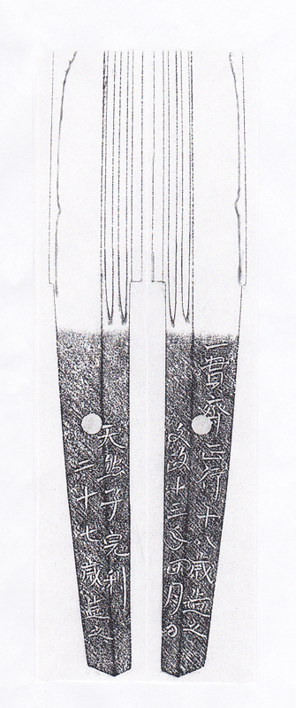 最後になったが、押型と写真による中心の捉え方は一長一短である。(13)図の刀を写真で掲載した「生誕200年記念 清麿」のカタログの13頁には、前述の化粧鑢の拙劣さが鮮明に写されているし、私も自分の眼と単眼鏡を使って確認済。併し、同書12頁の解説には「世上第二作目の作品ながら、名工への片鱗を見せ、茎仕立、化粧鑢も見事なまでに美しい。殊に棟方、刃方の仕上げも丁寧で、、、」とある。この解説者が誰かは知らぬが、恐らくこの刀の所有者であろうか、それにしても文責として名前を明示すべきが筋であろうし、主催者側もこの解説に同意したと受取られても致し方ない。
