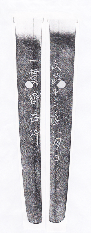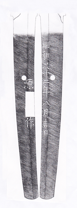 では、(12)図を見て下さい。正行(清麿)と兄の完利(真雄)の合作です。中心の鎬筋は全体的にスウッと通っていて、全く歪むことなく鮮明に押型にあらわれています。この様に中心の鎬筋というものは清麿に限らず、ちゃんとした刀工の作刀には必ず歪まないで通っているのが当り前でありまして、その様になっていない中心は銘字の真偽よりも前の段階で×という断定を下さざるを得ません。(12)図はそれこそ清麿の最初期作であり、真雄が師事した浜部そのものの出来ですが、それでも中心の仕立は完璧であります。但、この合作が例えば浜部寿幸の在銘であったら、高い世評は得られないでしょう。清麿の作であるから褒められたとしか考えられません。