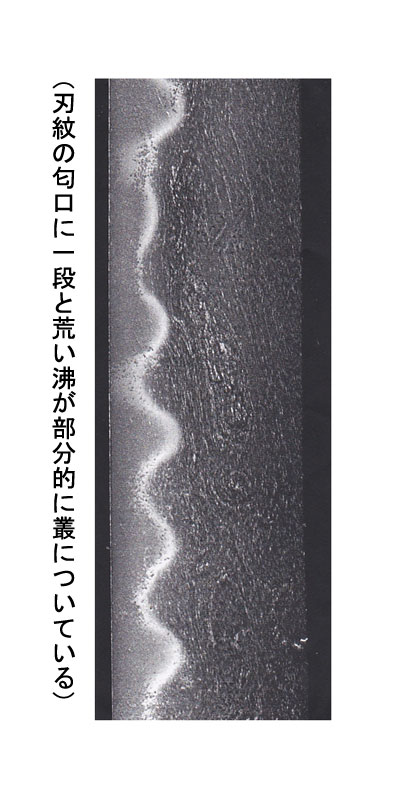 清麿については、戦前から特定の人によって作り上げられた神話に近いものが、現代にまで横行しています。姿の鋭さにしても同様です。こちらについては後日触れるとしても、清麿の作ならば刃文の匂口に叢や崩があってもOK。(14)図参照。むしろ逆にアバタもエクボとみて覇気や働があるなどと褒める様な解説は、真の刀の良さを間違った方向に導きます。清麿の他にも名工はいるのですから、人の尻馬に乗って無闇に清麿のみを重要視、愛好するのは罪であります。もっと自分の両眼で刀の本当の良さを確かめて下さい。そうすれば清麿の本当の良さが一段とおわかり頂けると存じます。併し、刀身の中でも中心に対する見方は決してゆるかせにしてはいけません。名工(一流以上)であればある程、中心仕立が良いのであります。