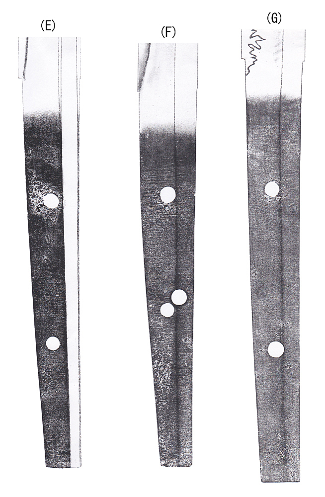 では(F)を見て下さい。これも刃長が二尺二寸八分、反五分二厘で大磨上と解説され、大和国手搔(南北朝)と極がつけられている由。確かに焼詰鋩子で柾目肌交じりで鎬幅も広く大和伝の造込。当然、五ヶ伝中の大和伝へいくが、問題は現在の刃区にむかって刃文が左斜目に入っていることである。こんな状態の中心で大磨上はあり得ない。従って、(F)は完全な生中心である。すると、(E)と同様に、少なくとも南北朝時代とみる事は全く不可能であり、当然、時代は下げてみなければいけない。勿論、例え大磨上であっても必ず正真銘は額銘にしても残すし、絶対に正真銘を切り取って無くす事はない。無銘はそうした大きなハンデがつきまとう。