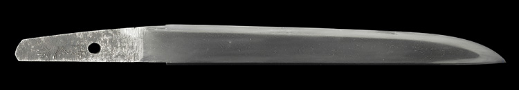平造り庵棟 うぶ茎 小板目肌よく詰み、地沸微塵につく。細かな地景顕われ、淡く沸映り立つ。刃紋は中直刃、浅く湾れて小乱れ交じる。匂い口ややフックラと小沸つく。僅かに小足、葉働く。金筋、砂流しかかり、明るく冴える。羽山浄六郎。羽山円真の六男。出鮫青貝散塗鞘合口拵入り。(刀剣保存会)