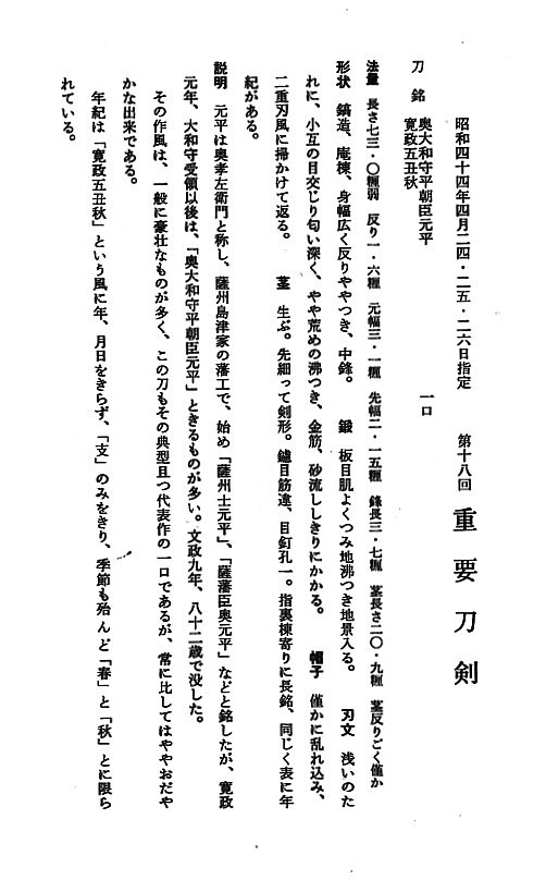 | 刀 | <売却済み>奥大和守平朝臣元平 寛政五丑秋 (第18回重要刀剣) | 江戸後期 | 重要刀剣 | 特優品 |