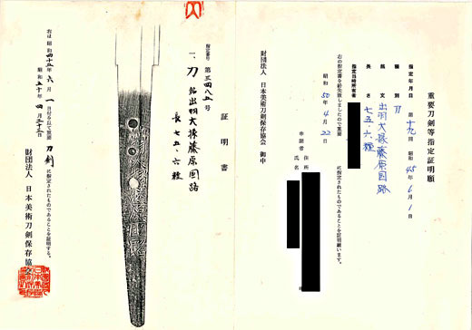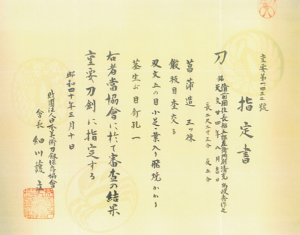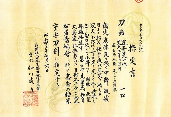 | 刀 | 備前國住長船五郎左衛門尉清光(備前)(山陽道) 為政秀作之 天文廿四年八月吉日 | 室町後期 | 重要刀剣 | 特優品 |
