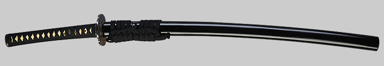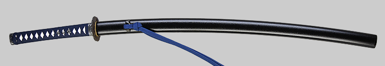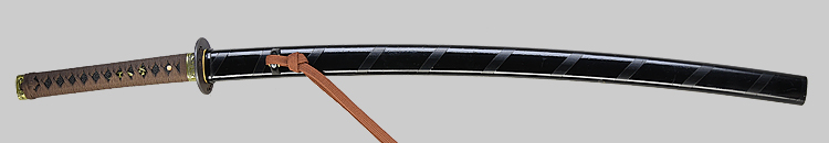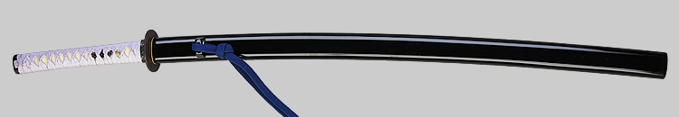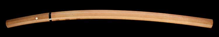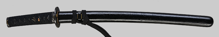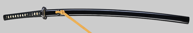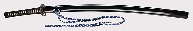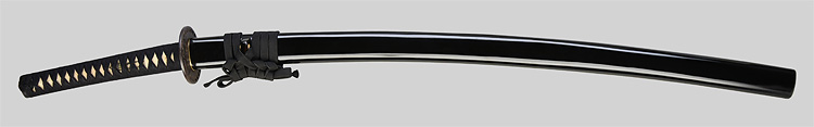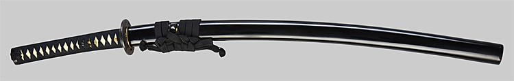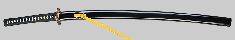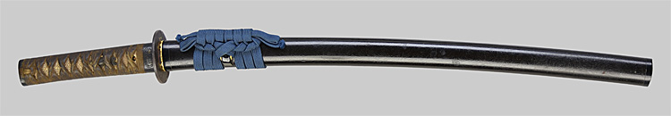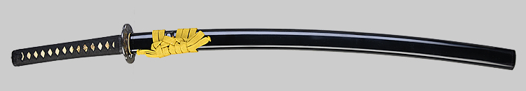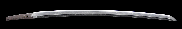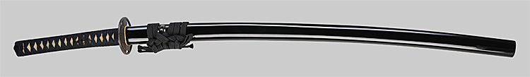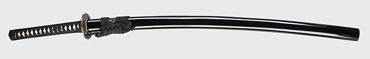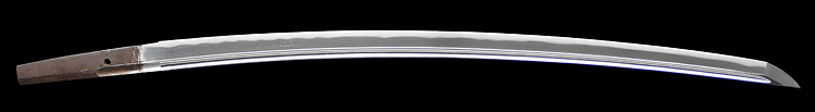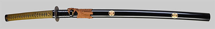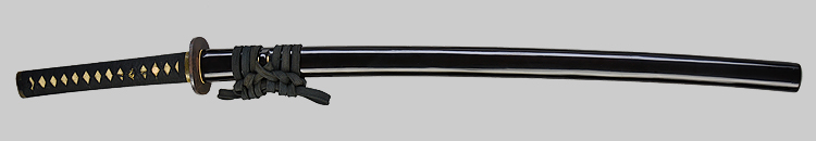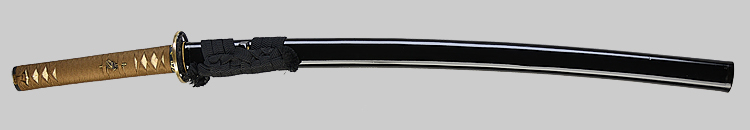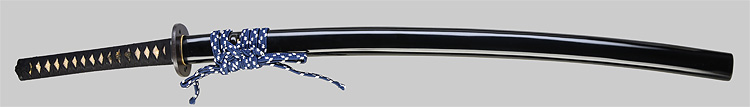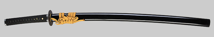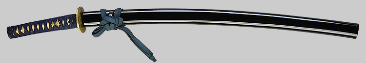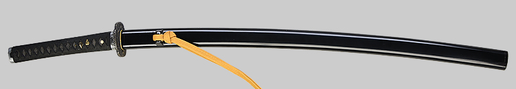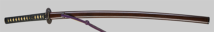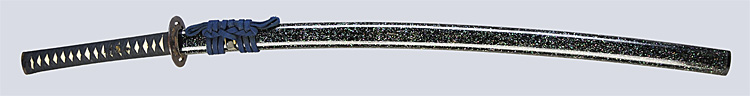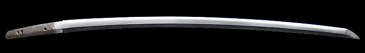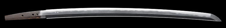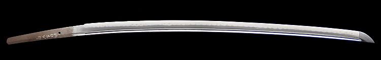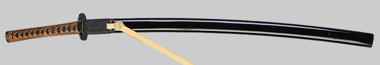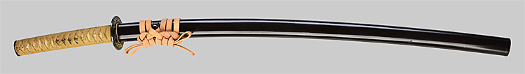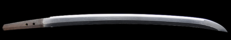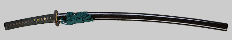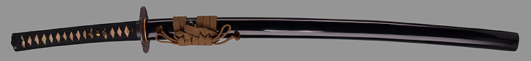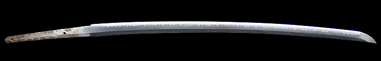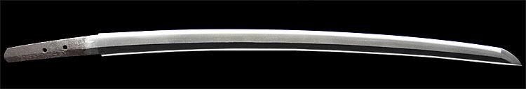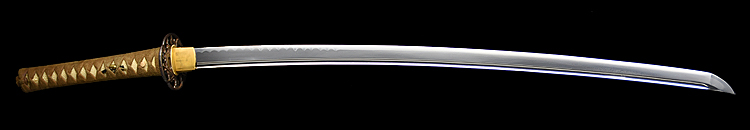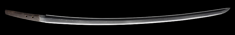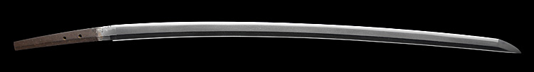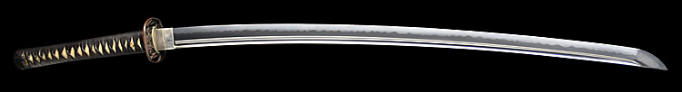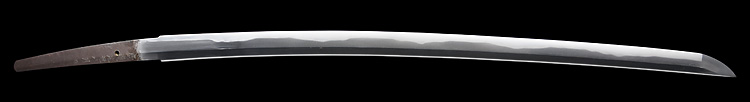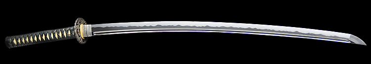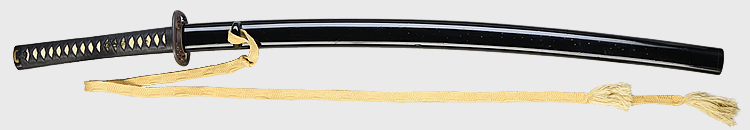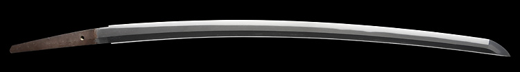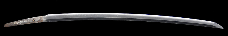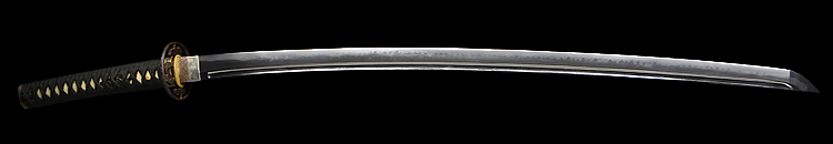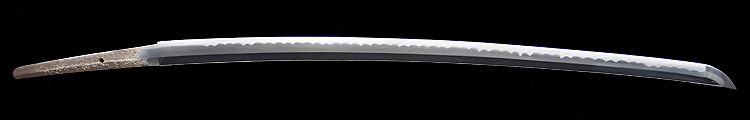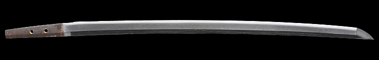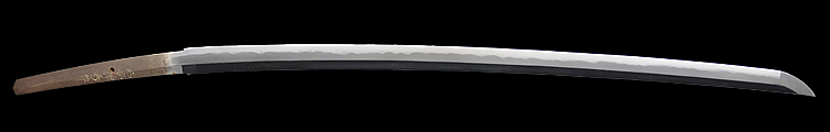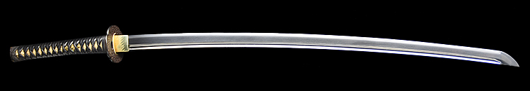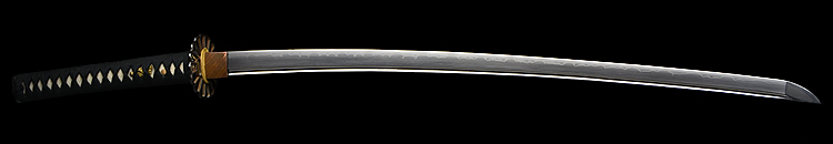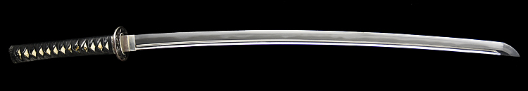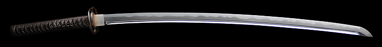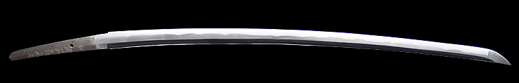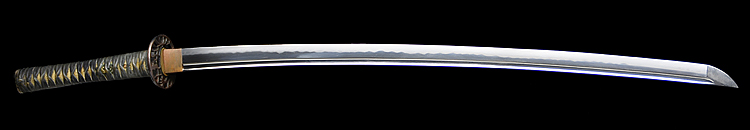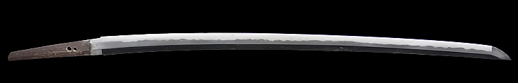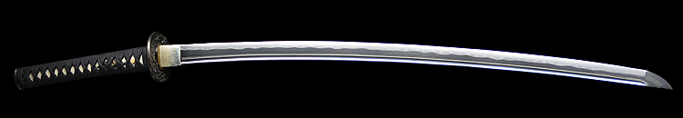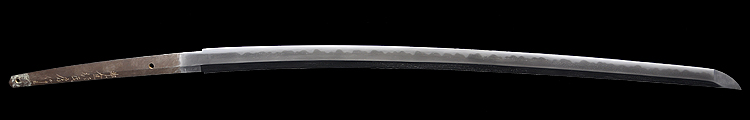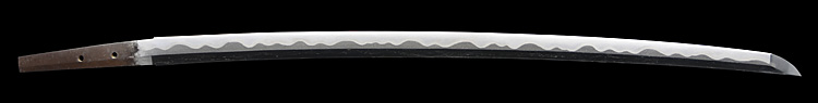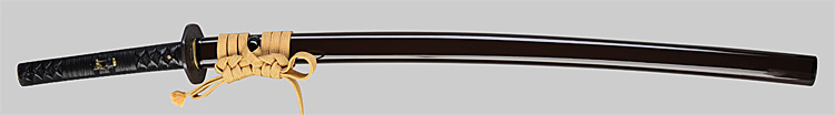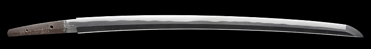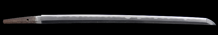 本造り庵棟 うぶ茎 小板目肌、杢交じり、よく詰む。地沸微塵に厚くつき、細かな地景顕われ、淡く沸映り立つ。(地鉄精美)刃紋は広直刃、浅く湾れて小乱れ交じる。匂い口締まりごころに小沸よくつく。刃縁ほつれ、細かな小足、葉、よく働く。刃縁に金筋絡み、匂い口明るく冴える。紀伊國康綱門人。赤坂千手院康道の末。黒呂塗鞘打刀拵付き。(特別保存刀剣)