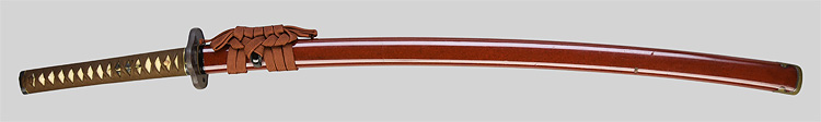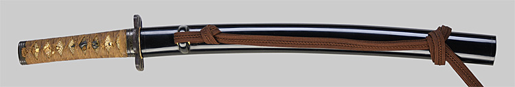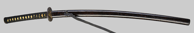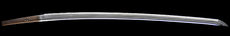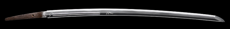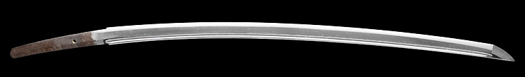 本造り庵棟 うぶ茎 小板目肌、杢交じりよく詰む。地沸微塵につき、細かな地景顕われ、淡く映り立つ。刃紋は中直刃、浅く湾れて小乱れ交じる。匂い口フックラと小沸よくつく。刃縁ほつれ、僅かに小足、葉働く。金線、砂流しかかり、匂い口沈み心に冴える。表裏に棒樋の彫刻。本名は森口次郎。宮本包則、笠間繁継の門。焦茶金散塗鞘太刀拵付き。(保存刀剣)