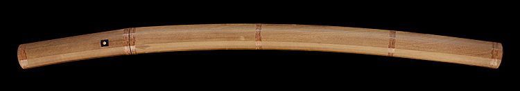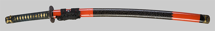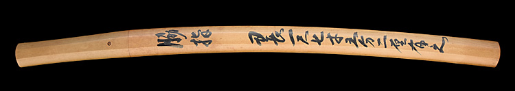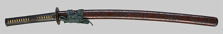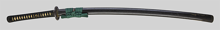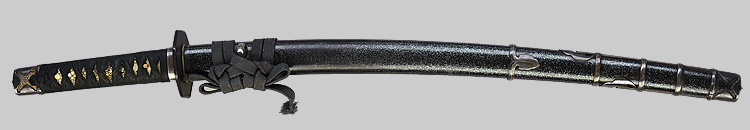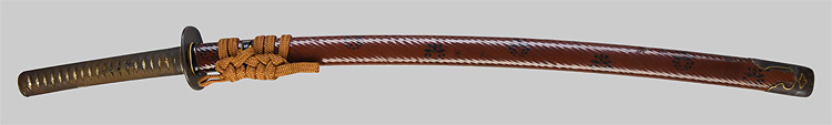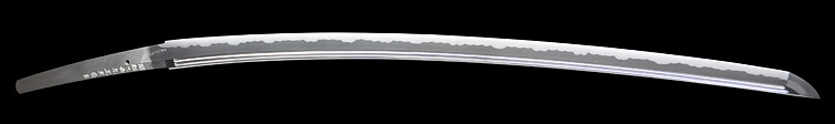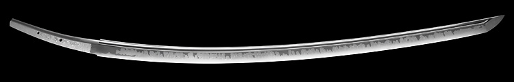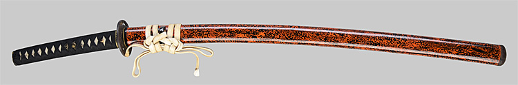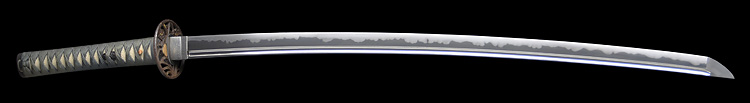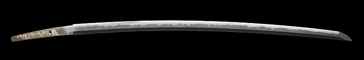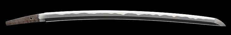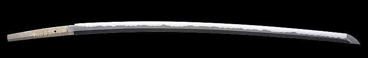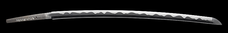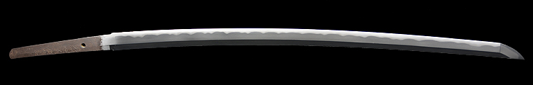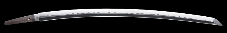 本造り庵棟 うぶ茎 小板目肌、杢交じりよく詰む。地沸微塵に厚くつき、細かな地景顕われ、淡く沸映り立つ。刃紋は湾れに互の目交じる。匂い口フックラと小沸よくつく。匂い足、小足、葉、よく働く。金筋、砂流しかかり匂い口明るく冴える。名古屋住。黒呂塗竹模様鞘打刀拵付き。(特別保存刀剣)
