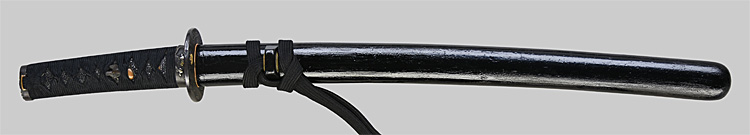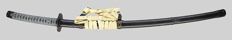 本造り庵棟 うぶ茎 小板目肌、柾交じりよく詰む。地沸つき、細かな地景顕われ白気映り立つ。刃紋は湾れに互の目、丁字交じる。匂い口ややフックラと小沸よくつく。飛び焼きかかり、足、葉よく働く。金筋、砂流しかかり、明るく冴える。表裏に棒樋の彫刻。本名は村山重明。元陸軍受命刀匠。黒石目塗鞘打刀拵入り。(980g)
